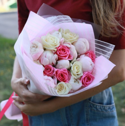 Букет розовые розы и пионы | Купить в Химках
