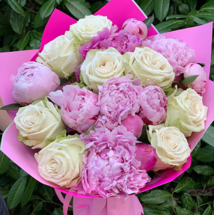 Букет состоит из розовых пионов и белых роз, украшенных свежими листьями. Розовые пионы добавляют нежности и изящества, а белые розы придают букету чистоту и неповторимость.