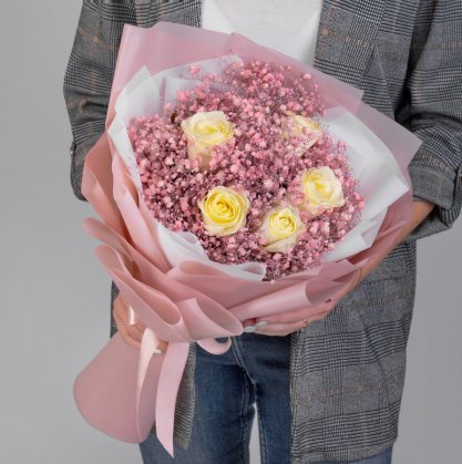 Букет "Нежные объятия" с крашенной гипсофилой и розой в Химках