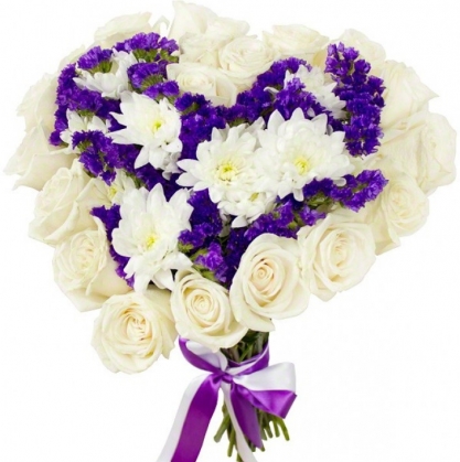 Букет сердцем из роз, хризантем и статицы | Купить в Химках