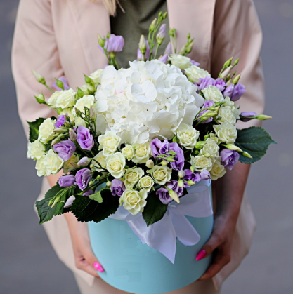 Шляпная коробочка из гортензии, кустовых роз и лизиантусов
