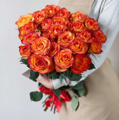 Букет из очень ярких оранжевых роз. Цвет розы, количество и оформление можно выбрать любое.