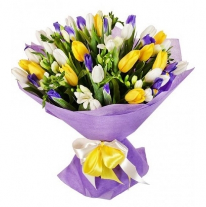 Букет "Три желания" из тюльпанов, ирисов и фрезии | Купить в Химках