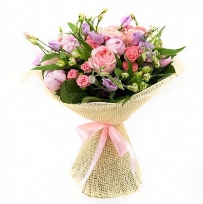 Сборный букет из пионов, эустомы и кустовых роз